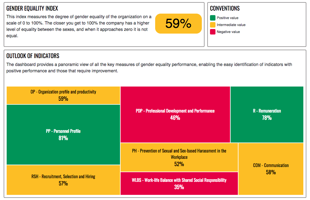 The EQUALITY@WORK online platform is a system of gender equality indicators in companies and organizations (herein referred to as “organizations”) that seeks to characterize, quantify and provide evidence regarding the degree of equality and gender gaps that exist between women and men in the workplace. The evidence is obtained through the generation of quantitative and qualitative information about the organizations that participate in the Gender Equality Seal (GES) programme or are willing to implement gender equality policies.